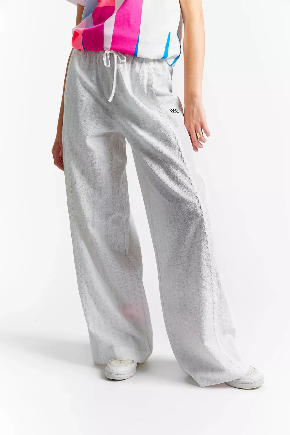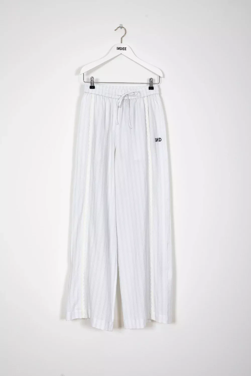 OCIETY est un pantalon léger en coton à taille haute avec une ceinture élastique et des cordons de serrage réglables. Ce pantalon évasé et décontracté est doté de deux poches latérales et est confectionné dans un tissu blanc semblable à une chemise. Une bordure en zigzag blanche descend sur les côtés des jambes, ajoutant une touche ludique, tandis que le logo IND est délicatement brodé sur la hanche gauche.