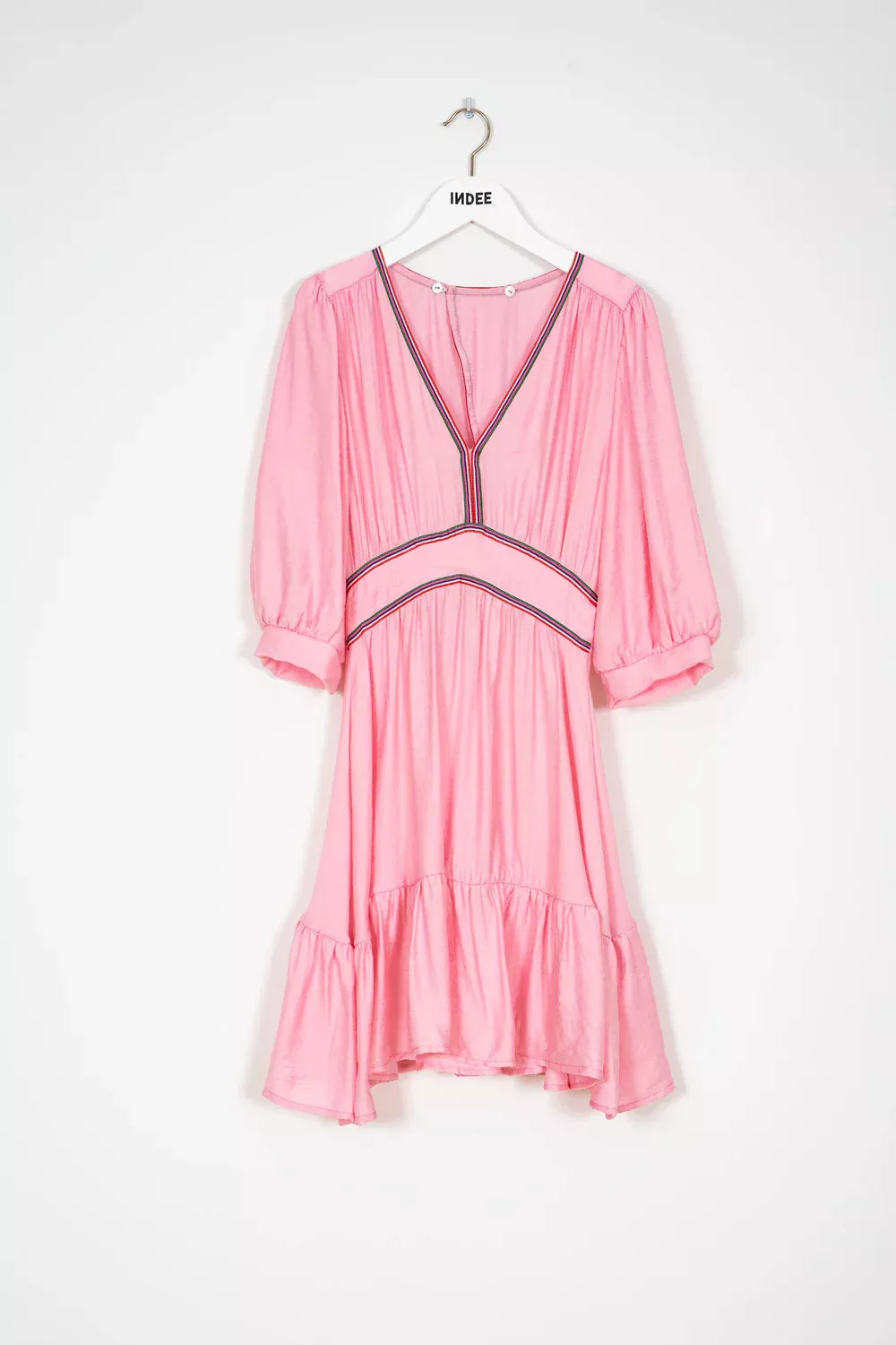 SAHARA est une robe en tissu léger et fluide. Elle présente un col en V, des manches 3/4 et un dos ouvert. Détails contrastés à la taille et à l'encolure.