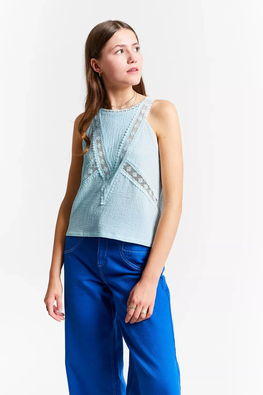 SQUASH en bleu ionique est un débardeur romantique bordé de dentelle. Fermeture boutonnée dans le dos. La conception sans manches et la matière légère le rendent parfait pour les journées chaudes.