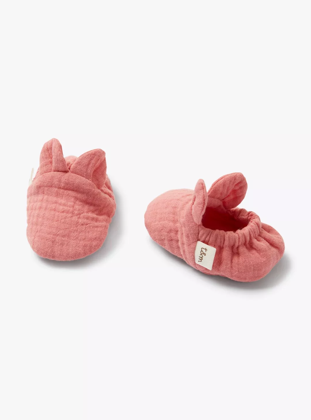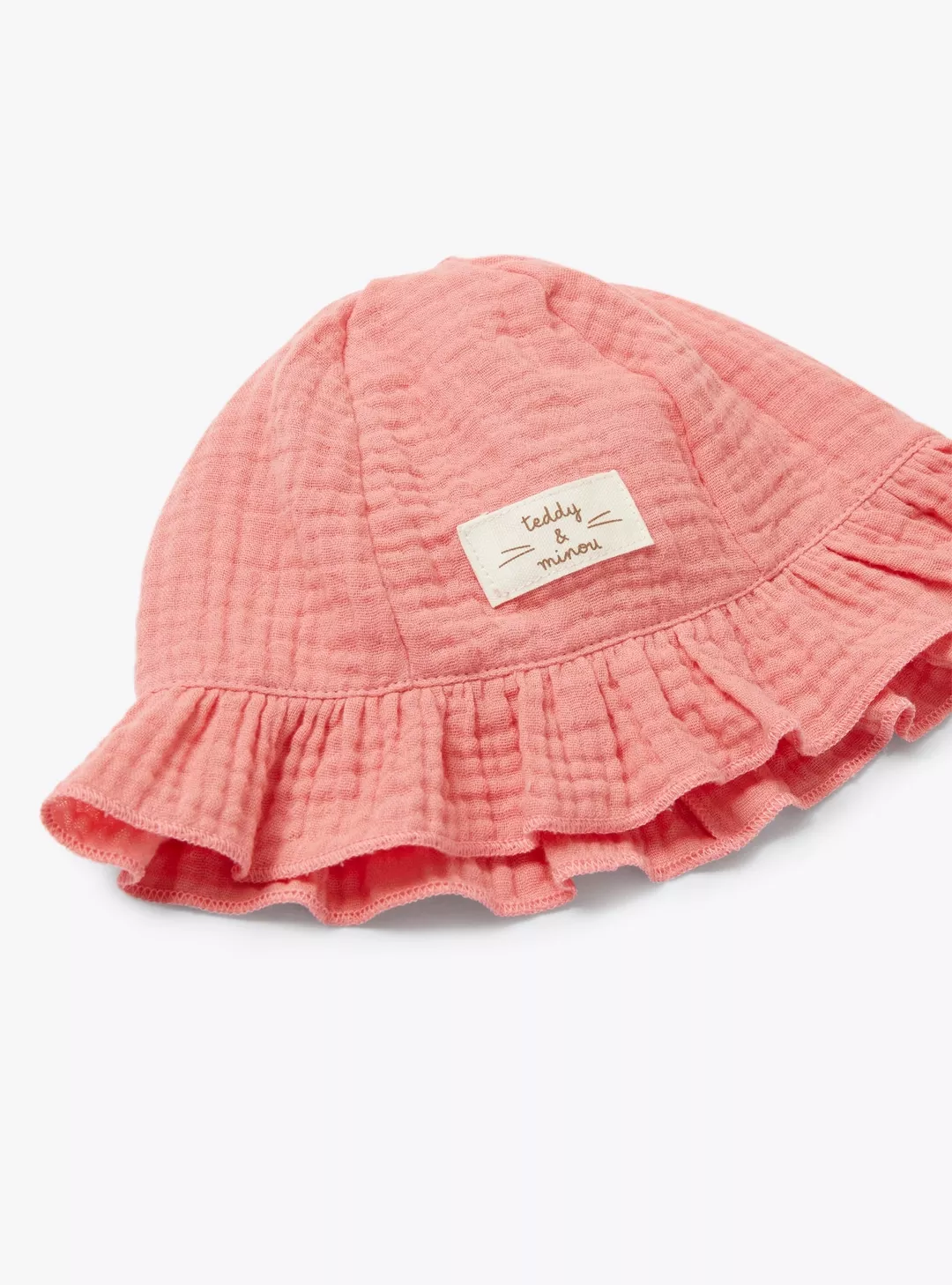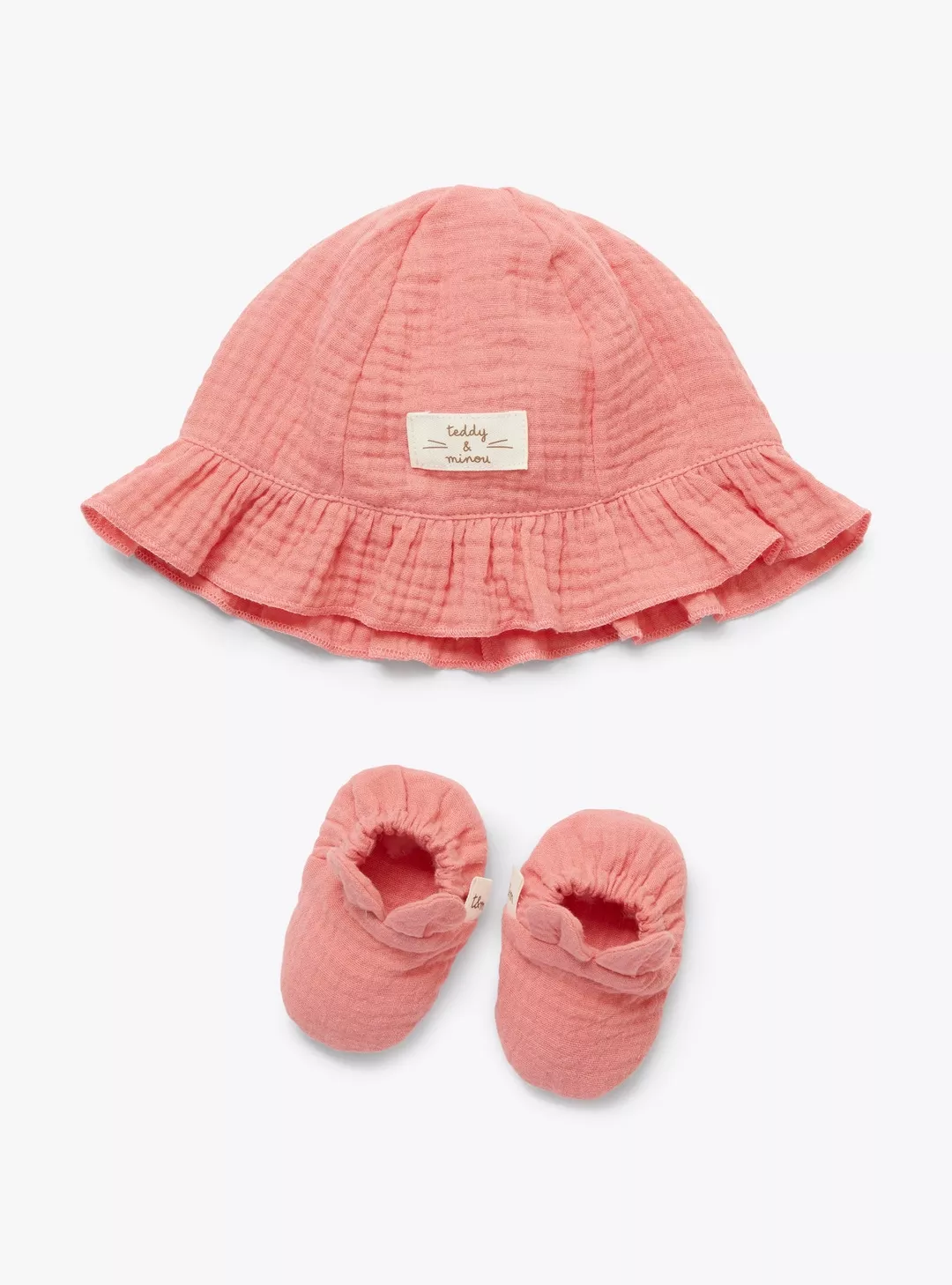 Ensemble en gaze de coton bio, composé d'un bonnet à bord volant et de petites chaussures avec finition élastique pour un ajustement doux et confortable. Un ensemble délicat et pratique pour accompagner les bébés durant la petite enfance.